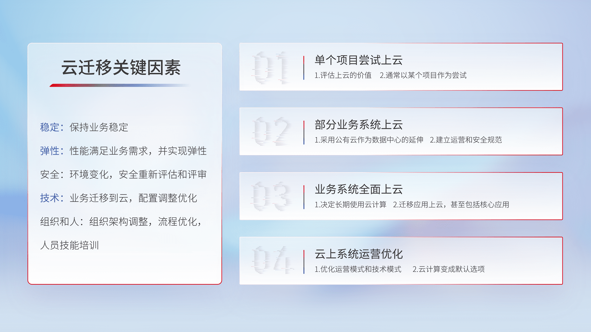 结合实际业务,,,从规划设计、、云平台选型、、、云原生改造、、、数据迁移、、集成交付,,,,迁移全过程为客户识别最佳上云路径,,,,做好风险识别管理,,,,设计网络架构、、、、身份权限、、、、安全审计合规、、、操作审计、、、、日志审计、、监控告警策略、、、多站点容灾设计等,,,对云上基础设施进行整体规划,,,提升IT治理水平,,,,以满足弹性、、、高可用、、高性能的需求。。。